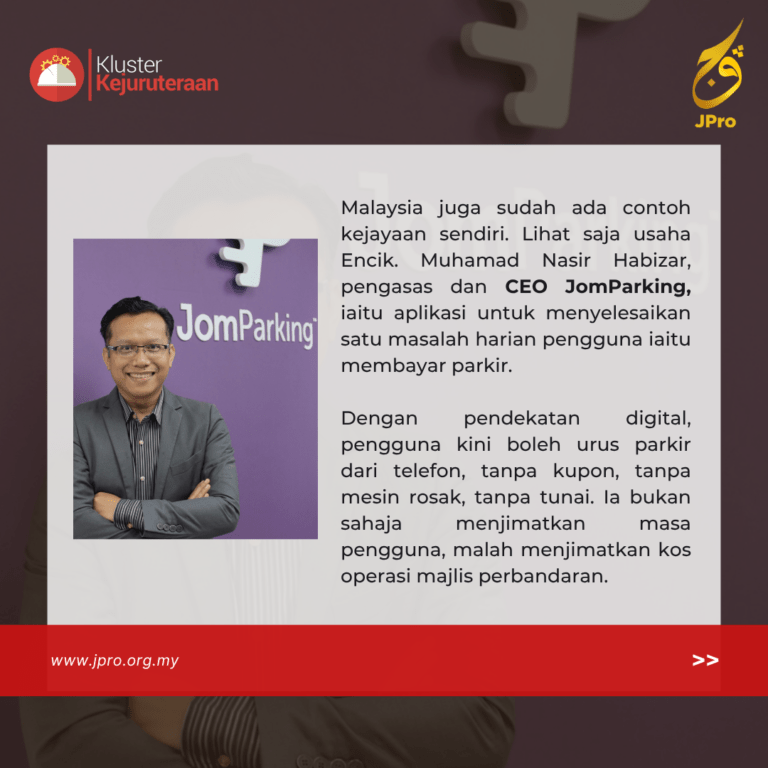 Malaysia juga sudah ada contoh kejayaan sendiri. Lihat saja usaha Encik. Muhamad Nasir Habizar, pengasas dan CEO JomParking, iaitu aplikasi untuk menyelesaikan satu masalah harian pengguna iaitu membayar parkir. Dengan pendekatan digital, pengguna kini boleh urus parkir dari telefon, tanpa kupon, tanpa mesin rosak, tanpa tunai. Ia bukan sahaja menjimatkan masa pengguna, malah menjimatkan kos operasi majlis perbandaran.