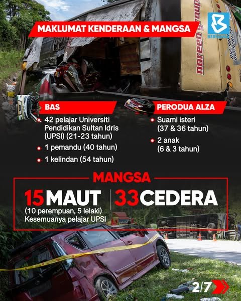 Salah satu tragedi paling memilukan yang masih segar dalam ingatan rakyat ialah insiden kemalangan sebuah bas universiti yang membawa pelajar Universiti Pendidikan Sultan Idris (UPSI). Bas tersebut dikatakan terbabas setelah cuba memotong di laluan berbahaya, lalu terbalik dan menghentam pembahagi jalan lalu mengorbankan 15 nyawa yang tidak berdosa. Mereka ialah anak-anak harapan negara dan keluarga, yang kini hanya tinggal nama.